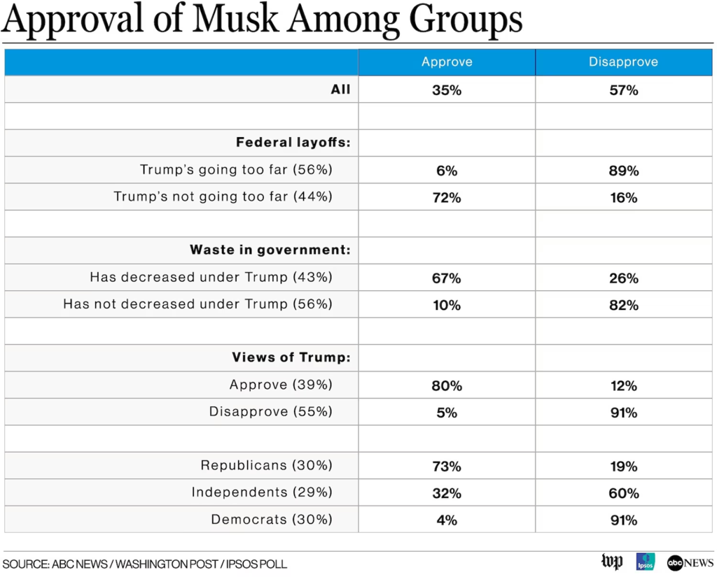 Elon Musk is well underwater in public views of his work for President Donald Trump, according to a new ABC News/Washington Post/Ipsos poll.