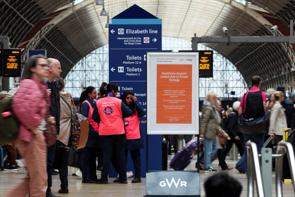 People wait at the Paddington railway station, after a fire at a nearby electrical substation wiped out power at the Heathrow International Airport, in London, March 21, 2025.