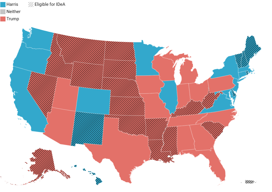 The IDeA states are: Alaska, Arkansas, Delaware, Hawaii, Idaho, Kansas, Kentucky, Louisiana, Maine, Mississippi, Montana, Nebraska, Nevada, New Hampshire, New Mexico, North Dakota, Oklahoma, Rhode Island, South Carolina, South Dakota, Vermont, West Virginia, and Wyoming, plus Puerto Rico. All the states but Delaware, Hawaii, Maine, New Hampshire, New Mexico, Rhode Island and Vermont voted for Trump in the 2024 election.